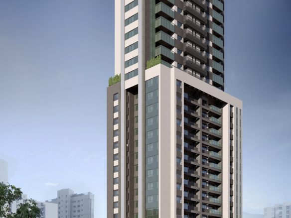 Torre única com 69 unidades e opções de plantas com terraço privativo e coberturas.
